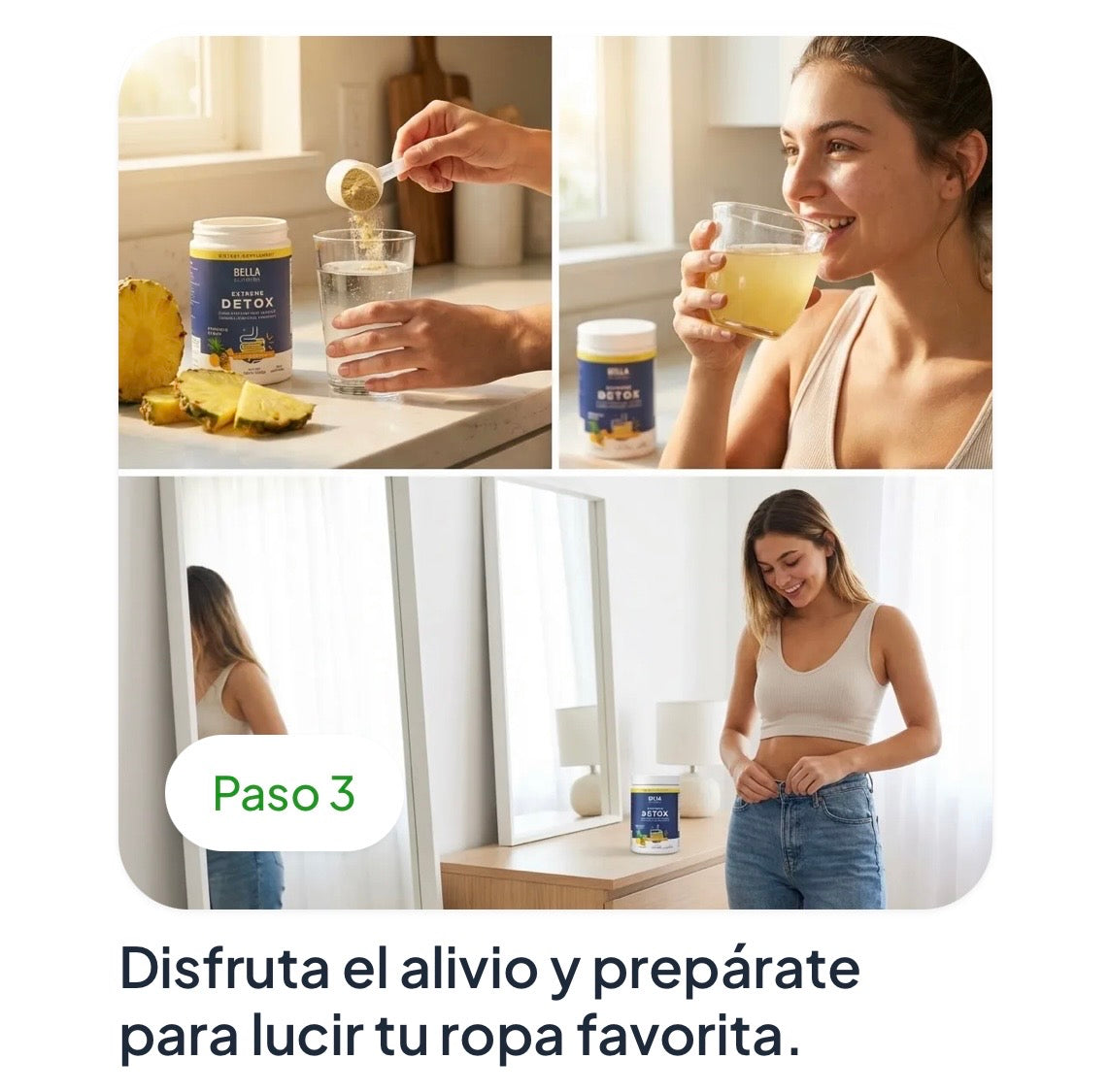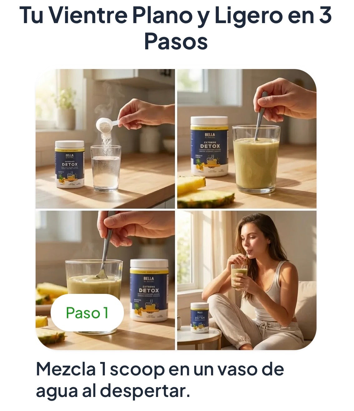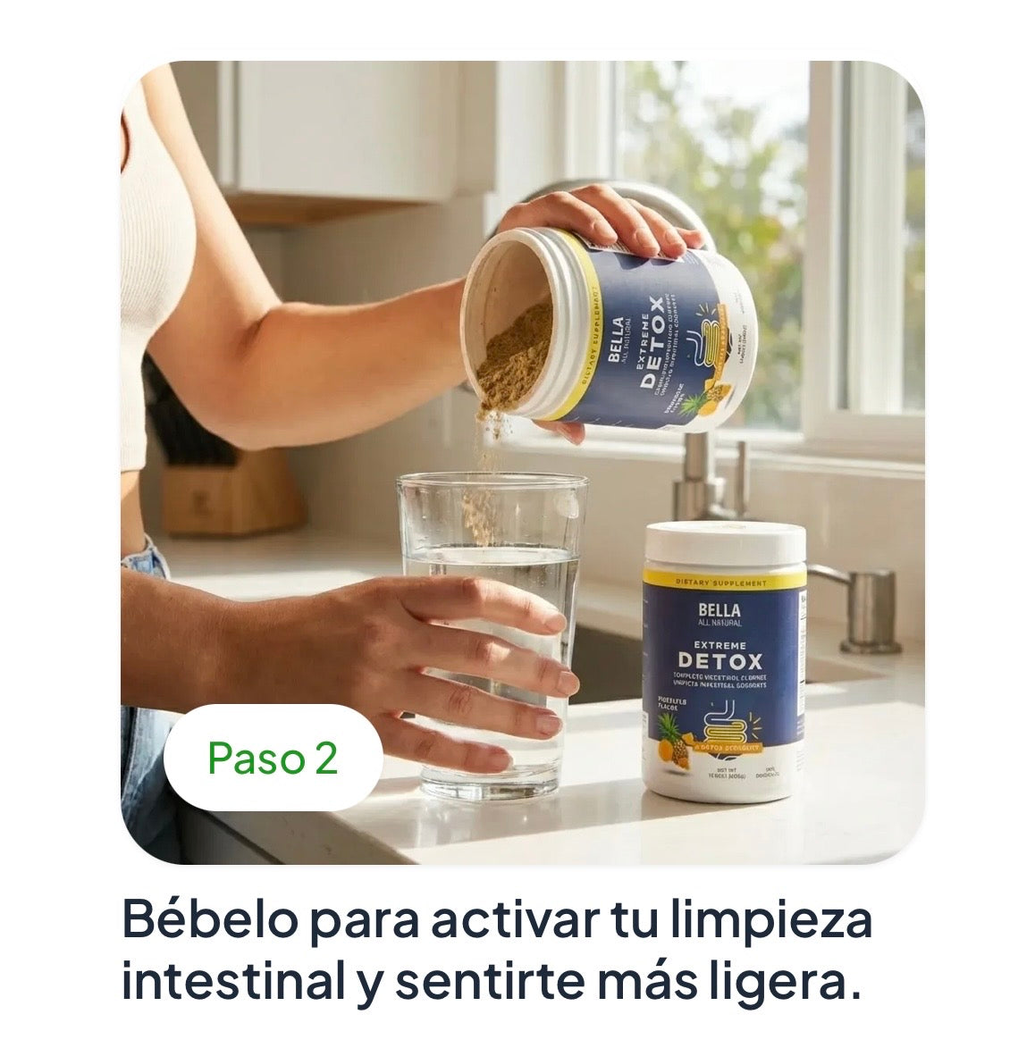 Bella Detox es un producto 100% natural y seguro para la mayoría de adultos saludables. Sin embargo, no se recomienda para mujeres embarazadas, en lactancia, personas con condiciones médicas preexistentes o quienes toman medicamentos regularmente. Consulta con tu médico si tienes dudas sobre tu caso particular.
